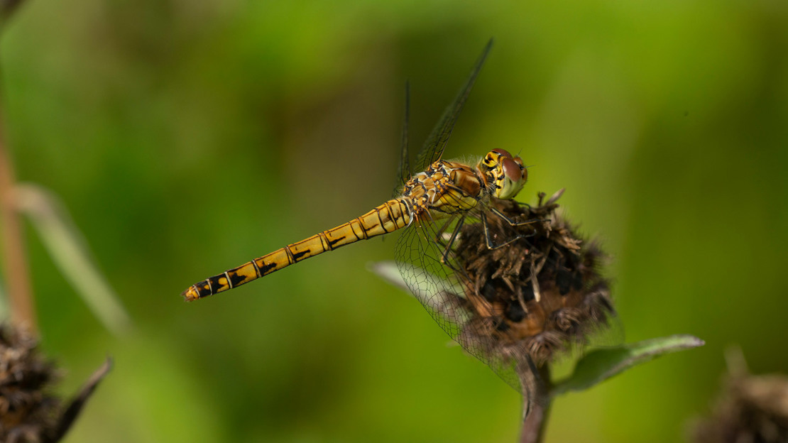 Dragonflies and damselflies look similar but can be told apart by their size and shape. Dragonflies are large and robust, whereas damselflies are longer and thinner. Take a look at the wing position when they are at rest too – dragonflies hold their wings out from their body, but damselflies tend to fold theirs in alongside their body.