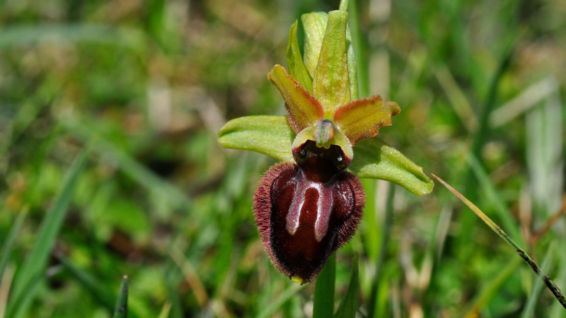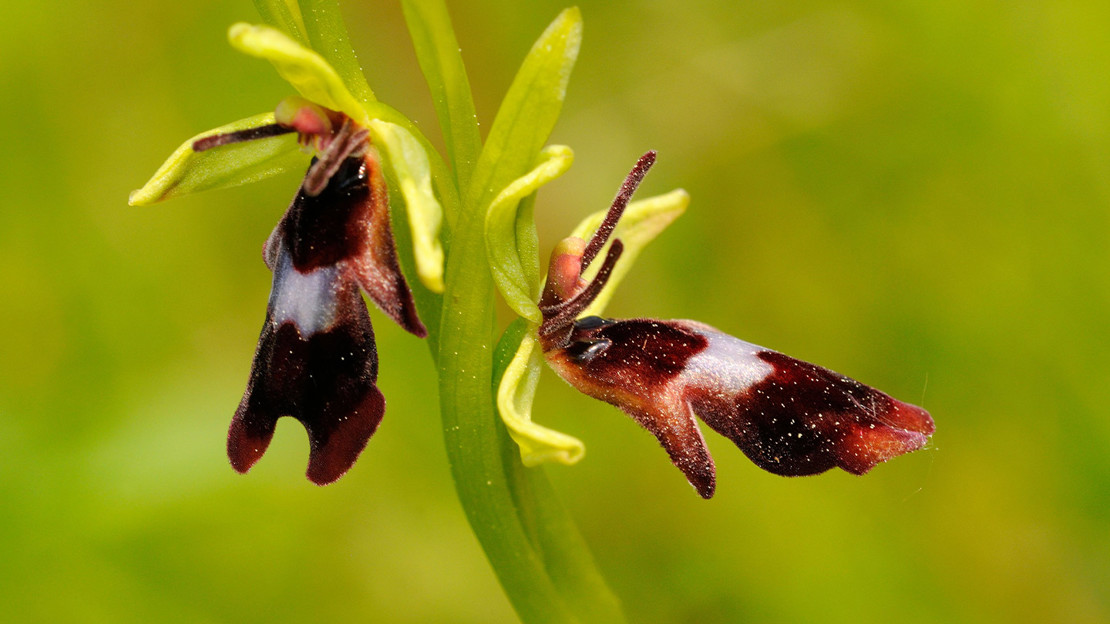 The fly orchid is aptly named as the flowers resemble flies. The lips of the orchid flower are dark brown in colour with two depressions at the base which almost look like the insects' eyes. It is a very distinctive orchid with each specimen carrying up to 15 flowers and the orchid often forms colonies of up to 10 plants. It is rare in the UK and is found more commonly in the south of England.