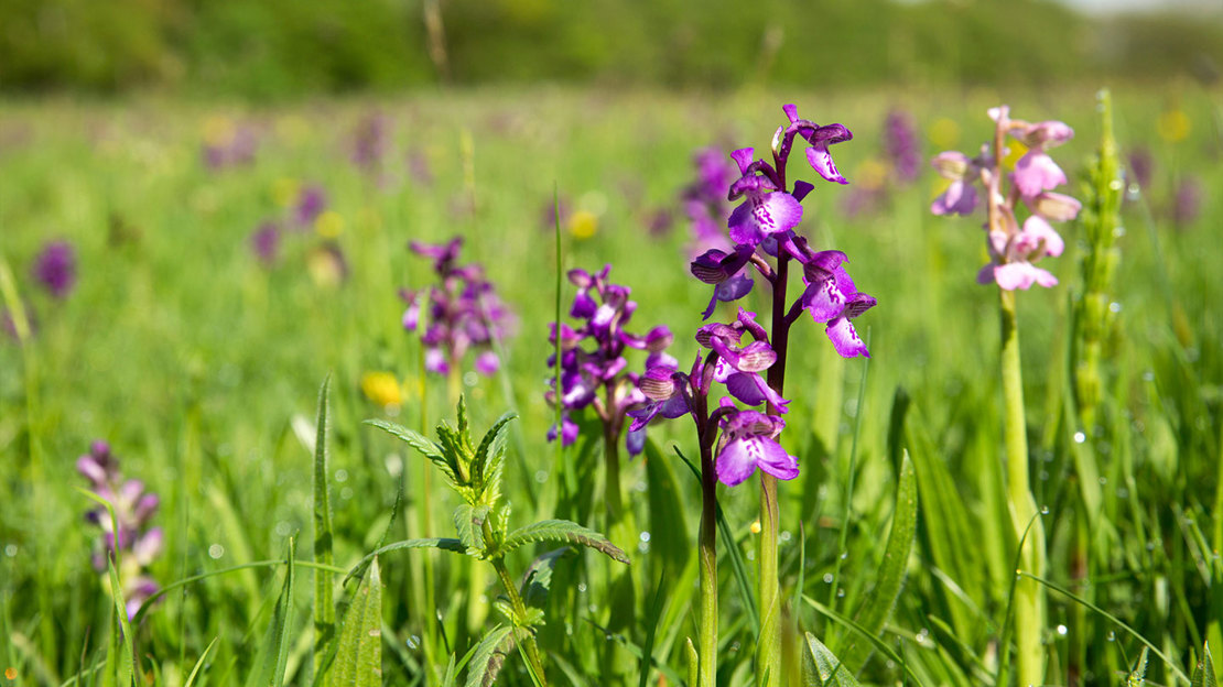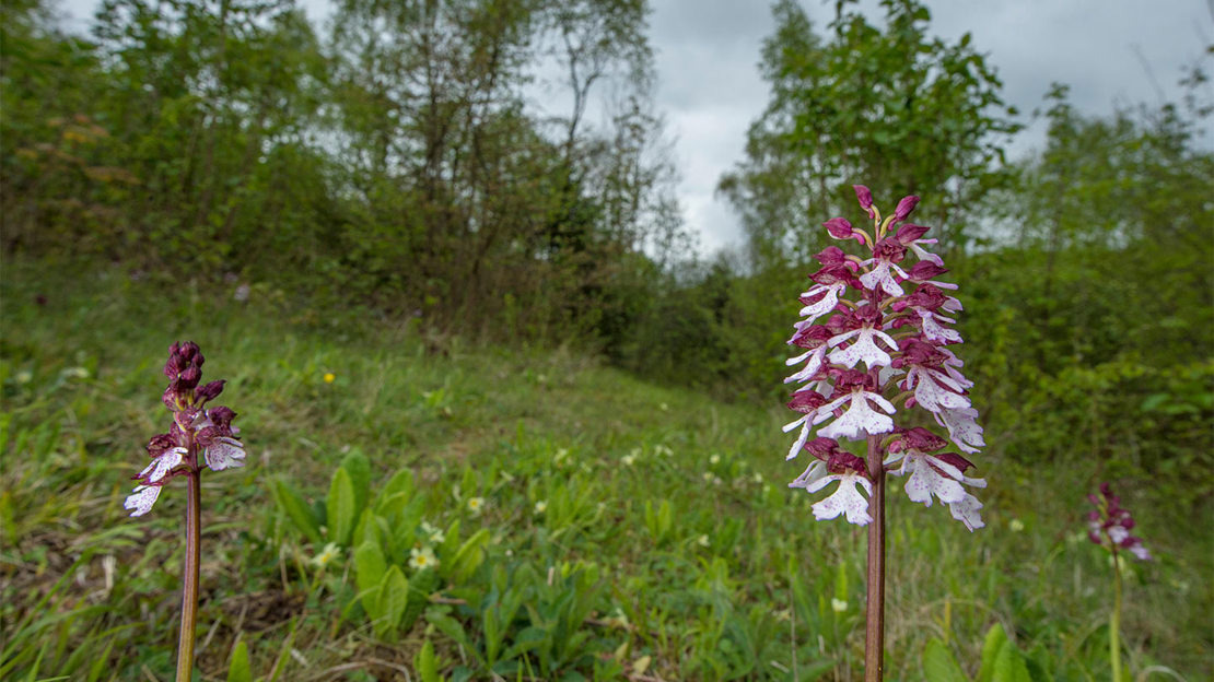 This species is more common throughout England and Wales and flowers in May and June. It has distinctive purple or pink flowers which have parallel green veins on the hood. These veins are not found on other similar looking orchids like the early purple orchid, which is more common.