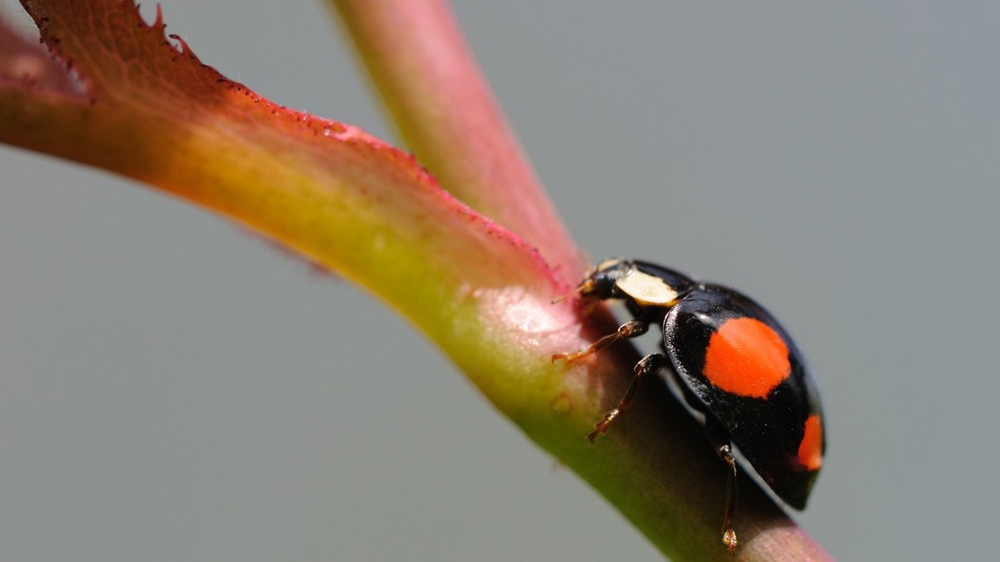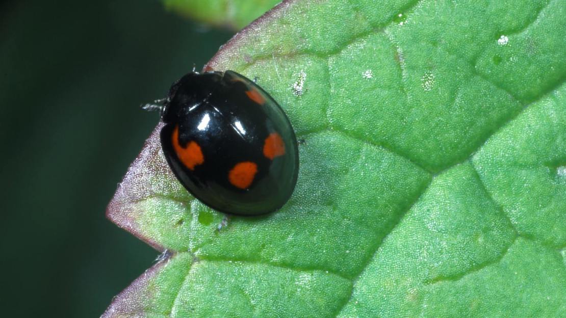 Smaller than the 7-spot ladybird and usually with just one spot on each wing case. Can sometimes be black with red spots. Also has black legs.
