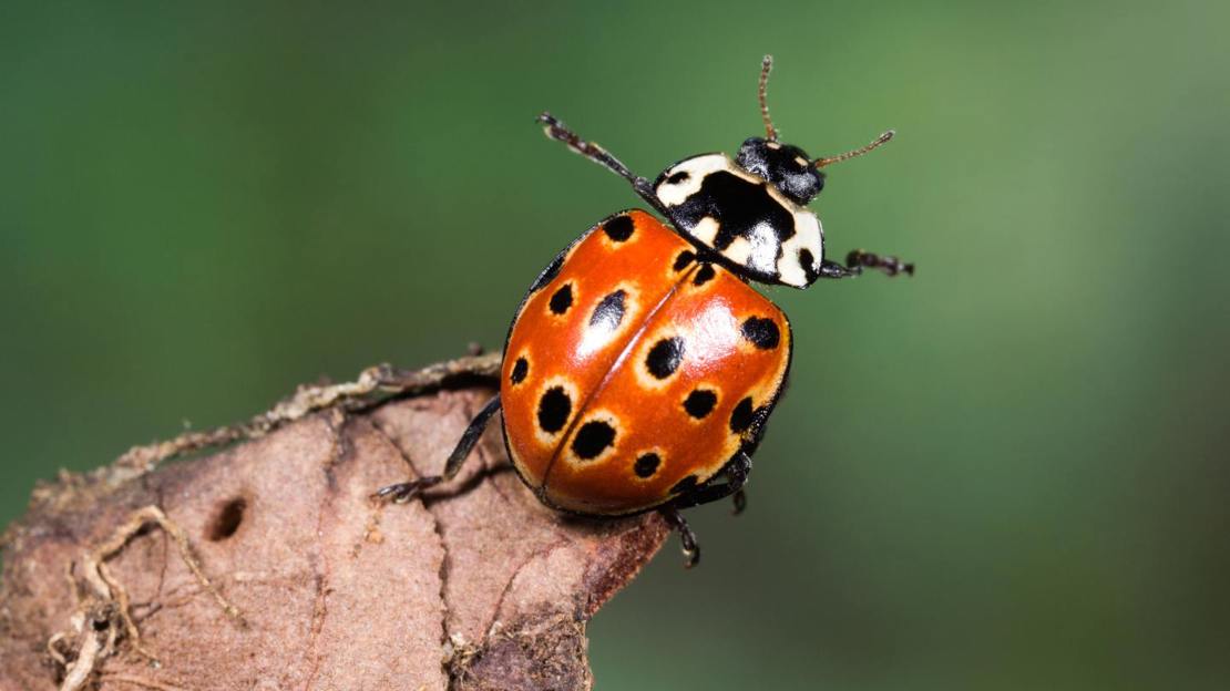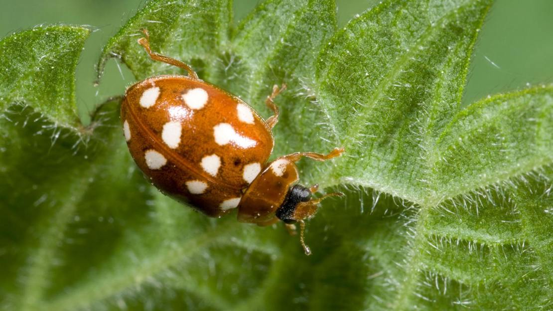 The orange ladybird has between 12-16 white spots on orange wing cases (which are lighter in colour than the similar-looking cream-spot ladybird).