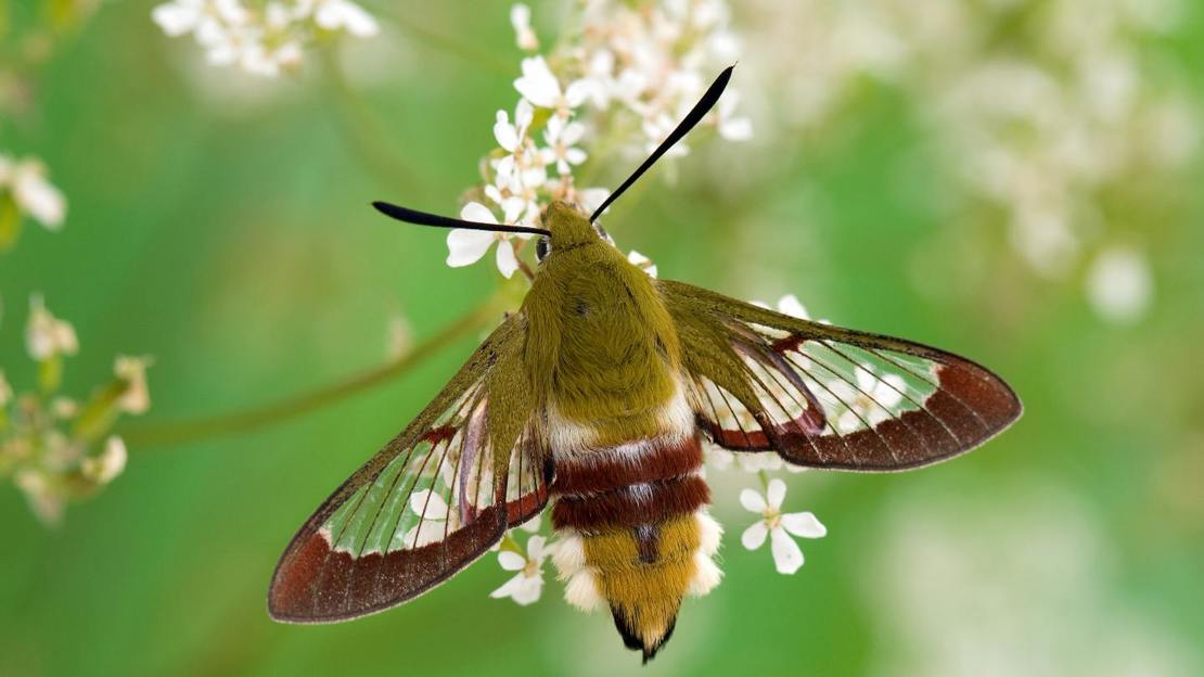 At first glance this moth could be mistaken for a bumblebee. Look for transparent wings bordered on the trailing edges by a rich reddish-brown. The greenish head and thorax is then separated from the yellow and black-tipped tail end by two red-brown bands. It also has thick black antennae.