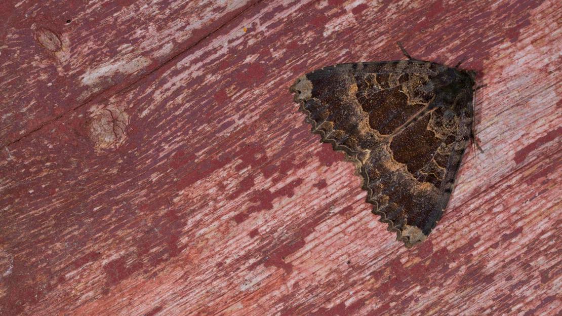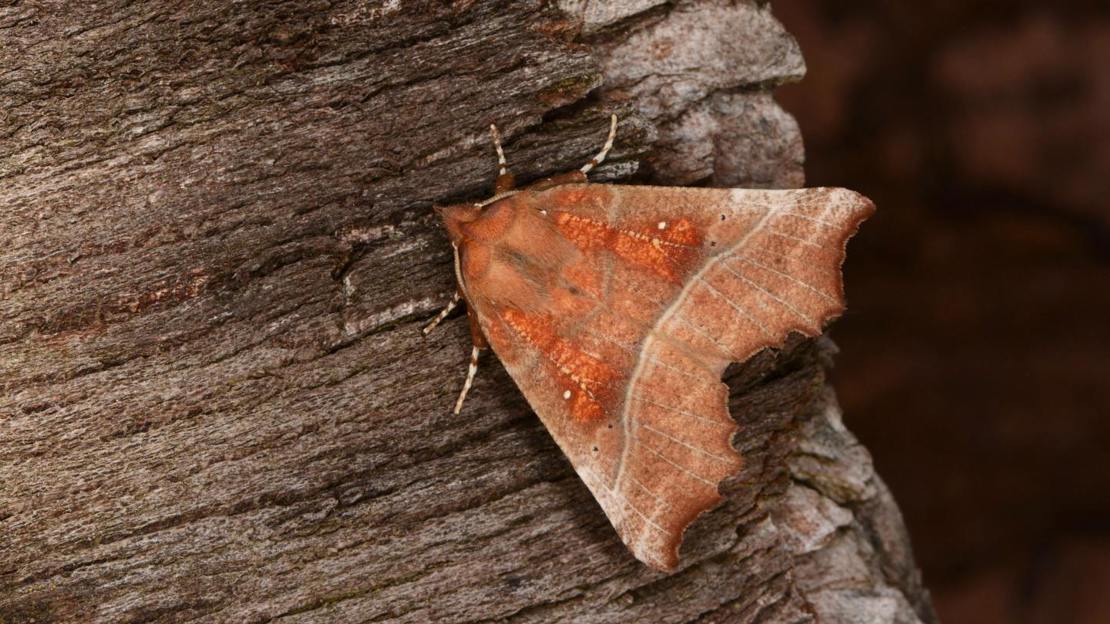 Another master of disguise that blends in perfectly with fallen autumn leaves. Look for the warm orange-red areas in the centre of the forewings and the intricately scalloped wing edges. There is also a distinct pale line that runs across both wings.