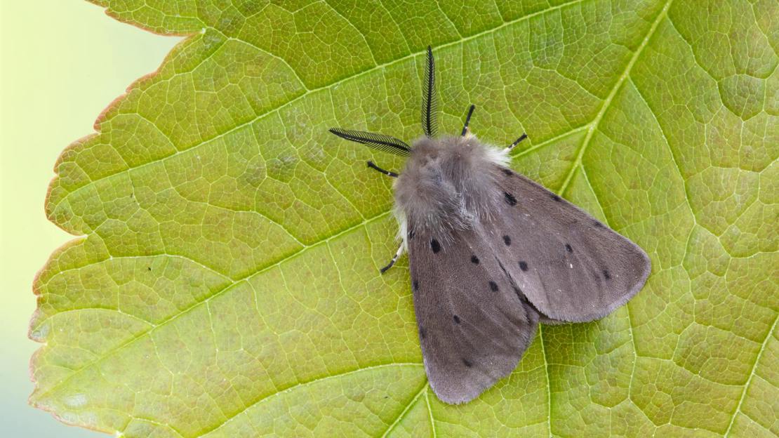 Male muslin moths are powdery grey with black spots (and in Ireland are creamy brown), whereas females are white with black spots and can be confused with the white ermine moth (Spilosoma lubricipeda). Their patterning is said to resemble the ermine trims worn on the robes of the British peerage. Also look for their furry shoulders and attractive, feathery black antennae.