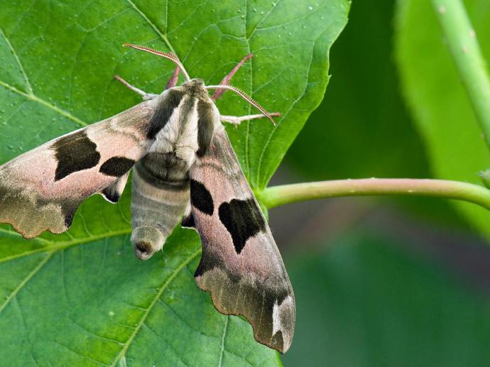 Similar at first glance to its larger cousin (above) but lacking the tail horn of other hawk-moths. The eye spots have reddish centres and the second set are much smaller than the first.