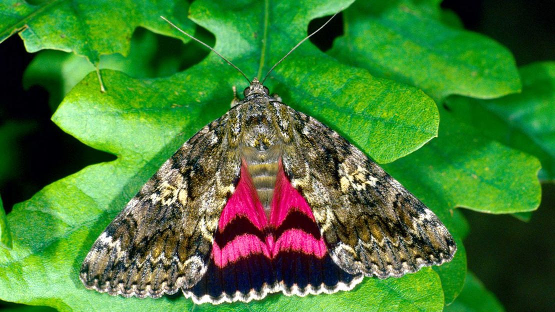 This secretly stunning moth can hide in plain sight thanks to the detailed bark-like patterning on its forewings. If you do manage to get close, it will reveal its true beauty when it flashes its crimson underwings.