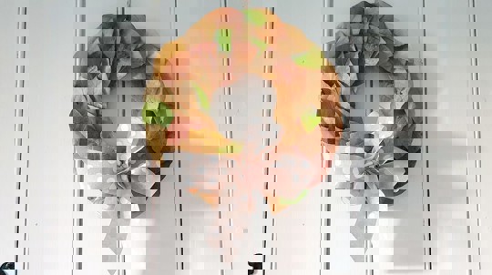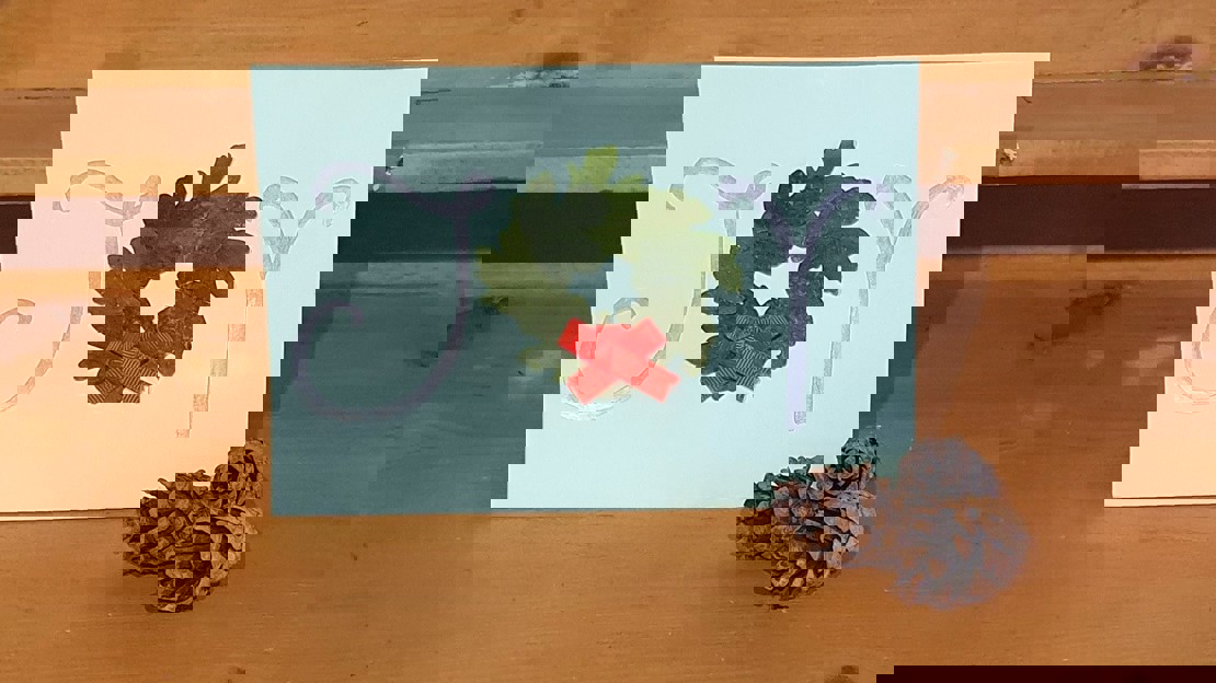 Collect a handful of small leaves and overlap them in a circle in the centre of the card, sticking them down with glue when you’re happy with the position. Add a small ribbon bow to make it look like a wreath, then draw or paint in the letters J and Y to form the word ‘joy’.