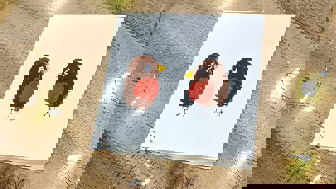 Dip your thumb in brown paint and press on the card to make the robins’ bodies. When it’s dry, use the tip of your little finger and red paint to print the chests, then add eyes, beaks and feet with different coloured paints or pens.