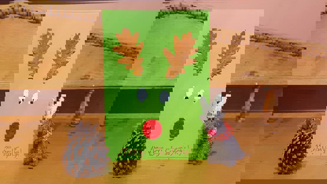 Start by adding eyes to the middle of the card by finger painting or brushing two blobs of white paint. Add smaller black circles when the paint is dry. You can use pens or pencils to make the eyes if you prefer. Then arrange the leaves and button to find the best position for the antlers and nose and when you find the right spot, stick them in place.