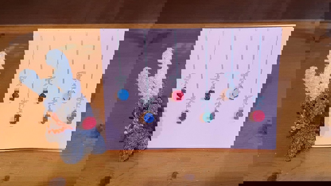 Simple but effective, glue some coloured buttons to your piece of card at different heights. Using the ruler and pen, draw a straight line from the top of the card to meet each button, and embellish with a little bow on each one.