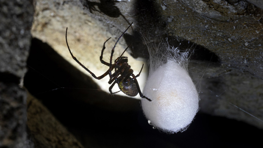 The cave spider is usually a black to reddish-brown colour, with a paler abdomen patterned with dark splotches. It measures from 10–15mm and is an impressive engineer, producing teardrop-shaped egg sacs which hang, suspended on silk, from the ceiling of their chosen hideout. Unlike adult cave spiders, which are repelled by light, the spiderlings are actually attracted to it, an adaptation which helps them to disperse and colonise new areas.