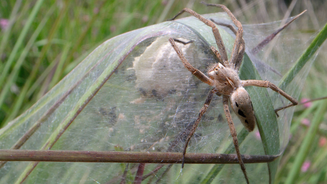 The nursery web spider gets its name because the female builds a silk nursery for her young. She carries her egg sac with her until the spiderlings hatch into the nursery, then stands guard outside.