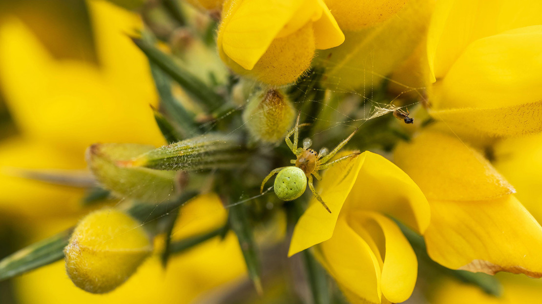 These bright and beautiful spiders might look exotic, but they’re one of the most common spiders in the UK. At just 3.5–4mm (males) or 4–6mm (females), they spin small webs amongst the foliage along woodland edges and hedgerows to catch flying insects, blending into the background thanks to their green abdomen and yellow-brown upper body.
