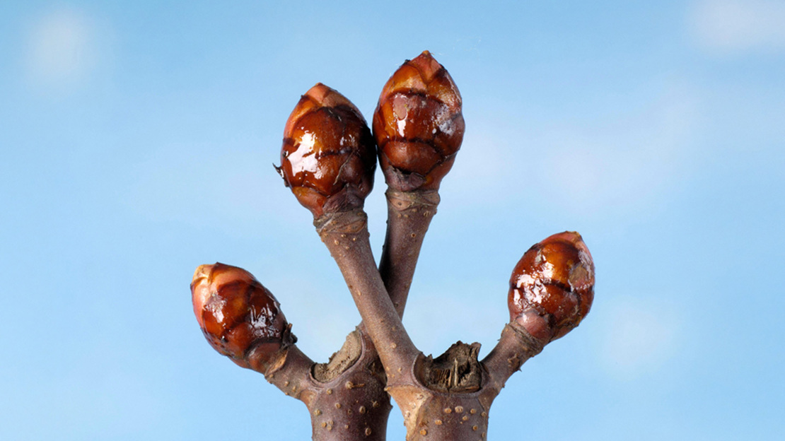 Laden with conkers in autumn but bare once winter arrives, the best way to identify horse chestnut is by looking at its bark and branches. The bark forms into grey-brown, flaky scales, while the twigs are tipped by dark red, sticky oval buds.