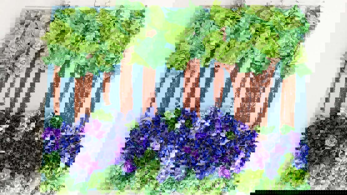 - To make a woodland scene, start by drawing tree trunks along the middle of your card. Glue green tissue paper around the top of the trunks and fluff it up to create a leafy canopy. Glue purple tissue paper around the base of the trunks, interspersed with bits of green, to create a thriving woodland floor.