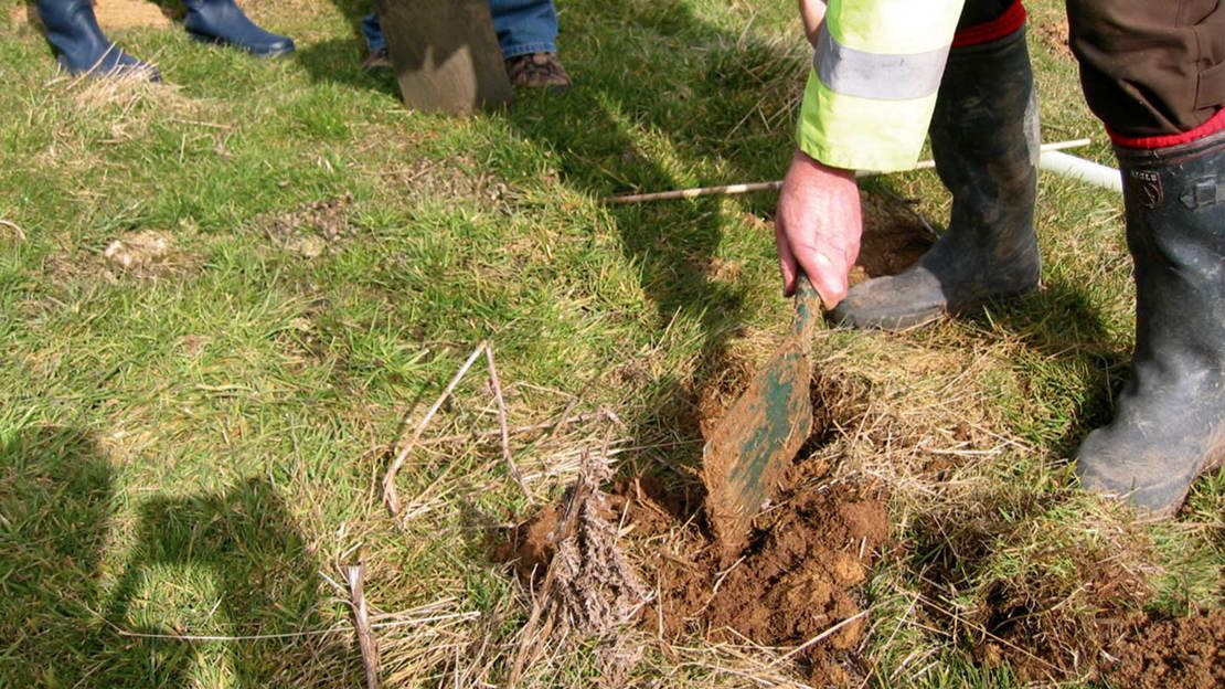 - Place the tree in the hole and ensure that the top of the root plug is around 2cm below ground level.