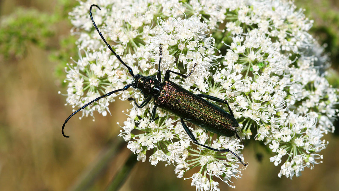 Aromatic and iridescent. Spot this musk-scented longhorn beetle glimmering on the trunks of trees.