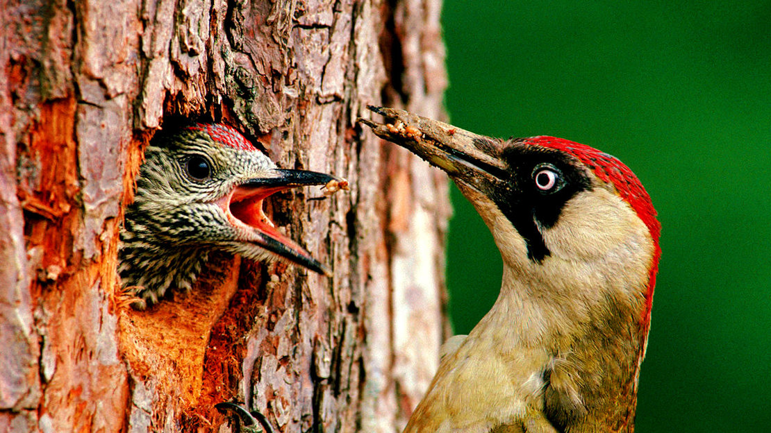 Green woodpeckers nest in holes in trees. They excavate these spaces themselves, using their powerful beaks to chip into the wood over a period of several weeks. Four to six eggs will normally be laid, hatching after around three weeks. The chicks fledge after a similar period.