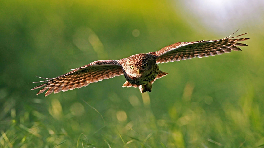 The little owl has piercing yellow eyes and mottled brown and cream colouring across its head and body. The wings are rounded and move with rapid wingbeats.