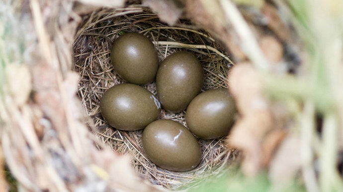 Breeding occurs between April and June, during which time four to five eggs are laid. The nest is constructed with leaves as well as grass, usually at ground level. Chicks will fledge when they are around 12 days old.