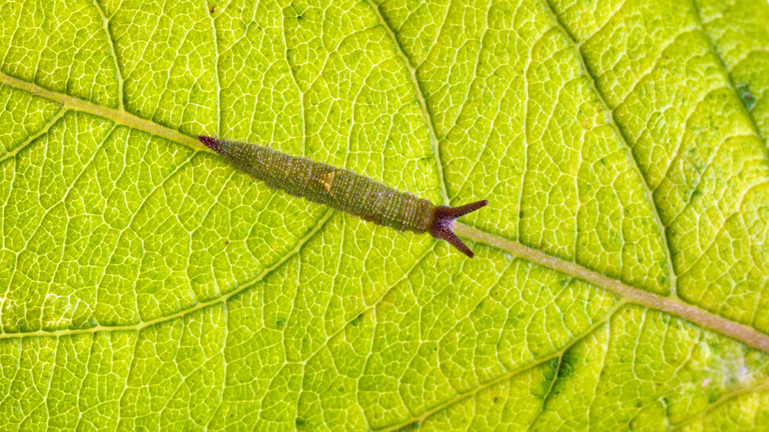 Purple emperor caterpillars overwinter as they mature, changing from a bright green larva to darker brown.