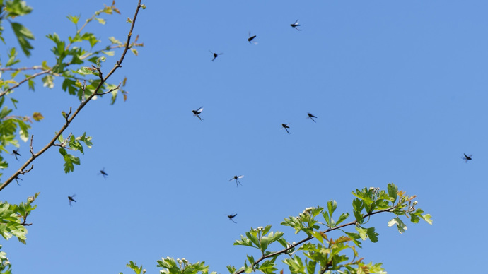 St Mark’s flies are short-lived insects, on the wing for just a week. The males emerge first – around St Mark’s Day on 25 April each year – and are usually in flight throughout May. You’ll often see them floating lazily up and down in big swarms with their long legs dangling, trying to attract a mate. Female St Mark’s flies normally appear a few days after the males emerge.