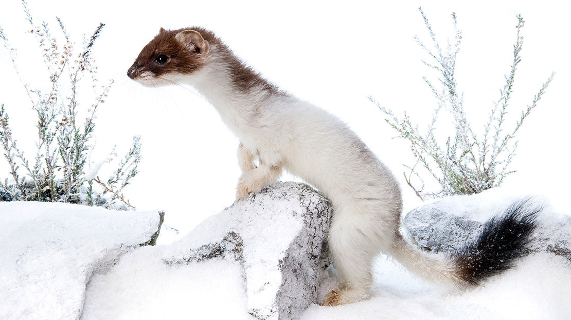 Some stoats turn completely or partially white in winter, particularly in northern parts of the UK where snow is more common, but the black tip on the tail always remains. The white fur is known as 'ermine' and helps the stoat blend in with snowy surroundings when hunting.