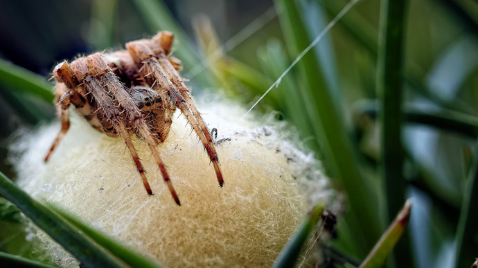 After mating in the summer, the female lays her eggs in a silken cocoon. She will not leave the eggs once they are laid, protecting them until the late autumn when she will succumb to the cold and die. The eggs will not hatch until May, emerging in a mass bundle of spiderlings.