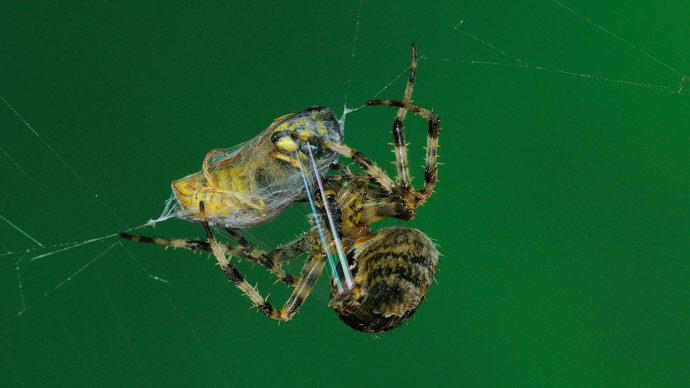 Flying insects are the primary food of the garden spider. To catch its prey, the spider weaves an elaborate web that traps any insects that fly into it. The vibrations of the trapped prey attract the spider, which delivers a paralysing bite. The insect is then wrapped in silk and stored for later.