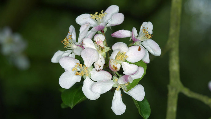 In spring, the sweetly scented blossom is pollinated by bees and other insects. The blossom develops into small, yellow-green apple-like fruits around 2–3cm across.