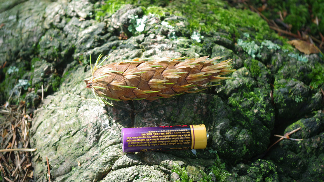 After pollination by wind, the seeds develop in the female cones. They hang straight down from the branches and change in colour from yellow to pink to light brown. From each scale protrudes a unique three-pointed bract.