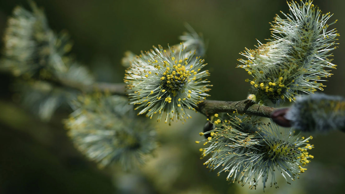 Goat willow is dioecious, meaning male and female flowers grow on separate trees. In early spring, the catkins develop – the male catkins grey, stout and oval, becoming yellow when ripe with pollen; the female catkins longer and green.