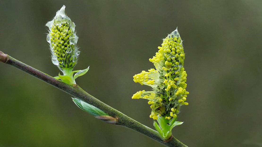Grey willow is dioecious, meaning male and female flowers grow on separate trees. The catkins arrive in early spring – the male catkins grey, stout and oval, becoming yellow when ripe with pollen; the female catkins longer and green.