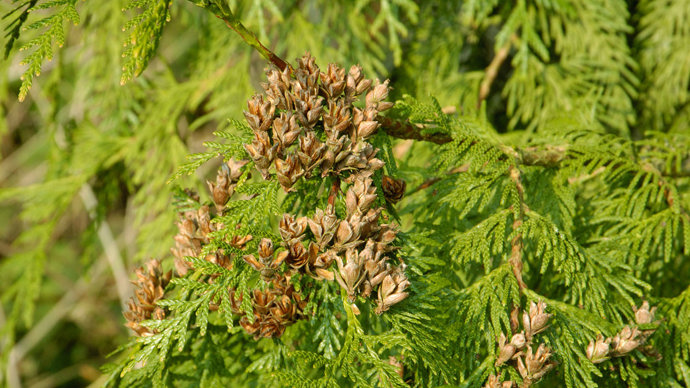 Native to North America, the western red cedar is planted in Britain, often as evergreen hedging in gardens or for timber. It is tolerant of dense shade.