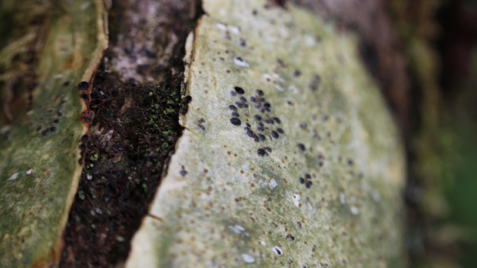 Temperate rainforests are particularly good for Lobarion and Graphidion lichens. Probably the most recognisable is tree lungwort (Lobaria pulmonaria) which is a large, leafy lichen. It literally looks like the lungs of the forest. Then there's the rare ‘blackberries-in-custard’ lichen (Pyrenula hibernica, pictured), a ‘crustose’ lichen which presses tight to the smooth bark of trees like hazel, and characteristically splits the bark.