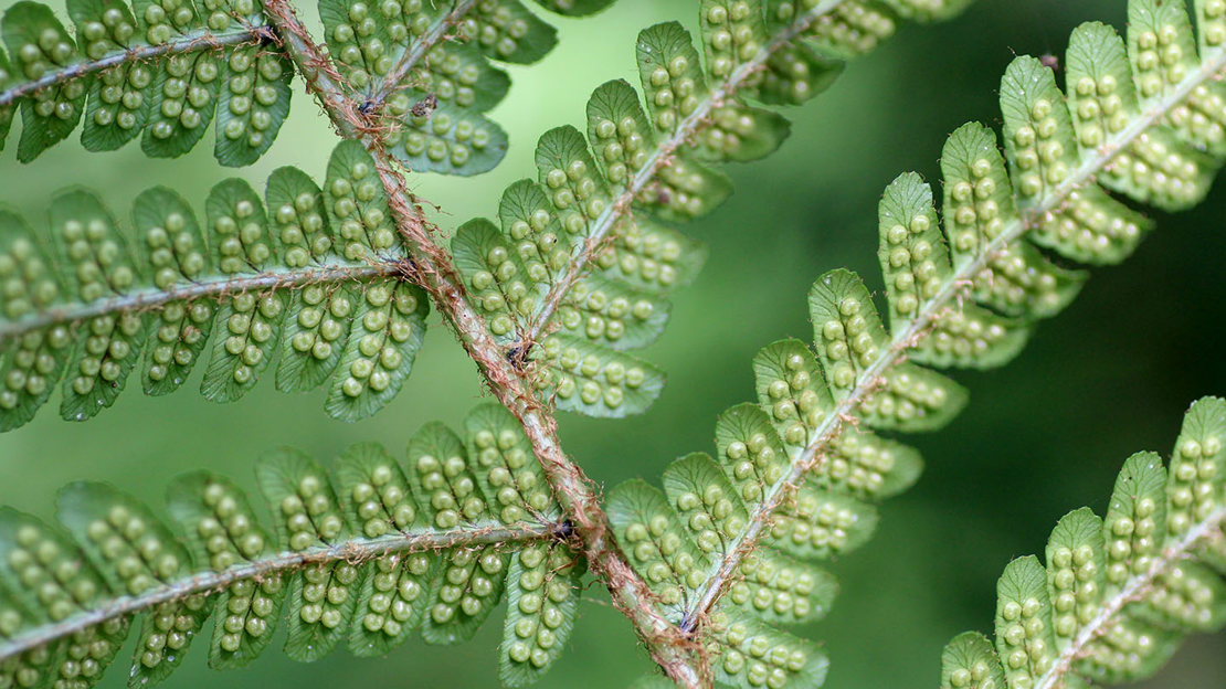 Sori/spores: sori (where spores are stored) have a kidney-shaped covering and measure between 0.5–2mm wide. Spores ripen July to August.