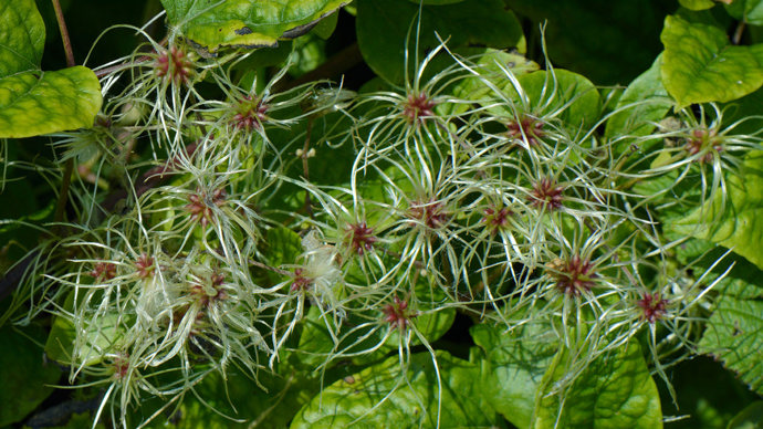 Fruit: seed clusters which have a feathered appearance and are white-grey in colour. They are called achenes. It is the fruit which gives the plant its other name: 'old man’s beard'.