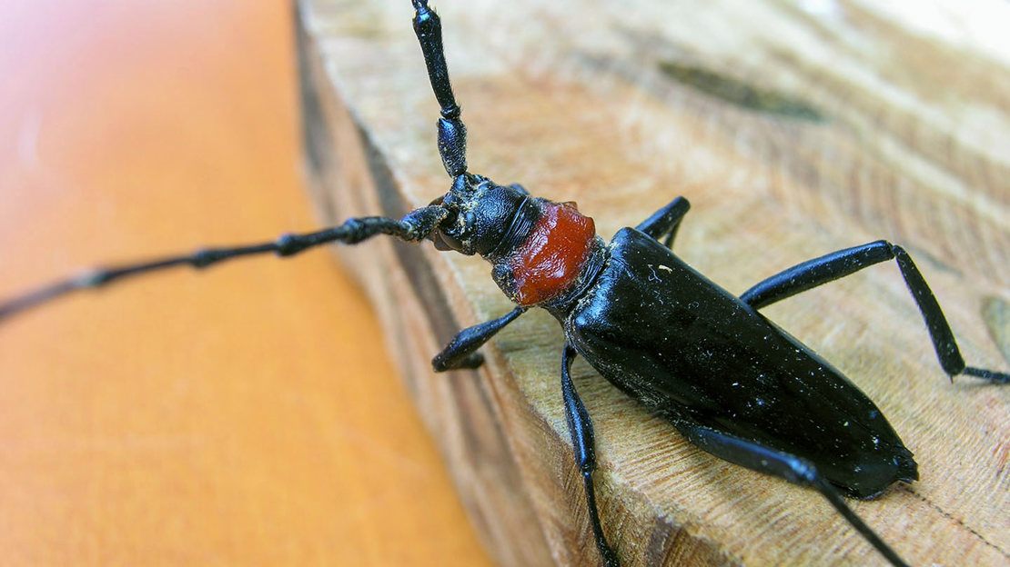 The red-necked longhorn beetle is native to eastern Asia and is a serious threat to trees in the genus Prunus like cherries and plums. Its larvae tunnel and feed under the bark and in the wood causing low fruit yield and possible death.