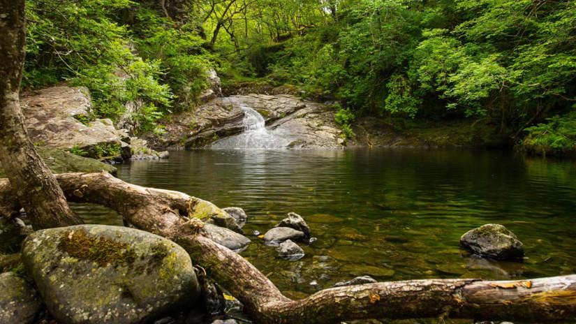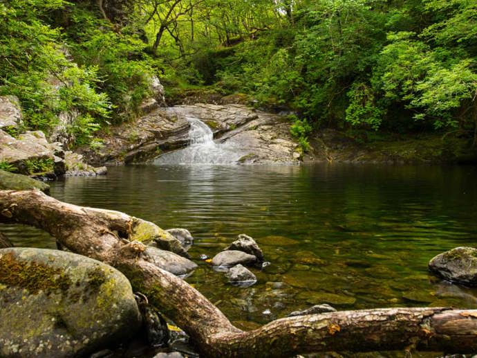 The main entrance is at the lower end of the woodland where a double gate is located. From here, a footpath loop follows the valley of the Ceunant Llennyrch, starting fairly wide and level but becoming steeper as it rises towards the waterfall at the eastern end of the wood.
