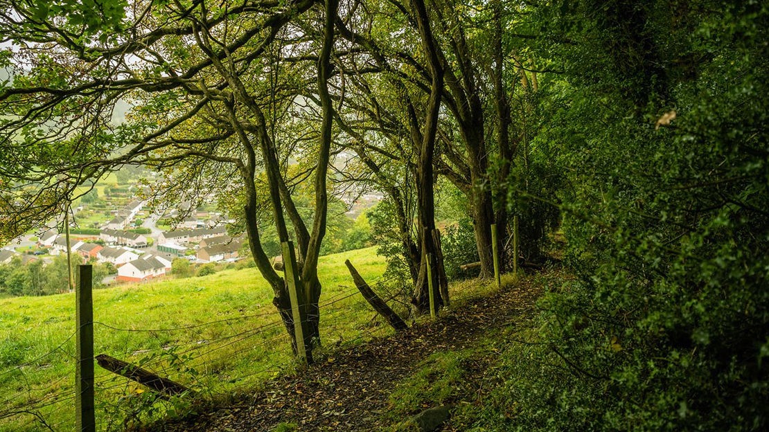 A public footpath runs inside the north-eastern boundary of the wood and follows an old track for the most part. The internal paths and tracks are unsurfaced and moderate to steeply sloping in parts. The path surfaces, particularly on the eastern side of the hill, are loose shale and can be slippery in both wet and dry conditions. The red circular route is 2km (1.2 miles/40 mins). The blue extension loop is 1km (0.6 miles/20 mins)