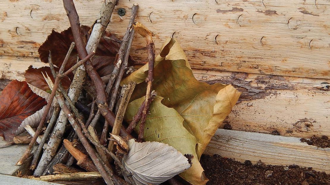 Divide it into sections and stuff each part with different natural materials. Dry leaves, twigs, hollow stems, dead grass, pine cones and bits of bark are ideal. They’ll help to create warm, dry spaces that will attract different creepy crawlies.