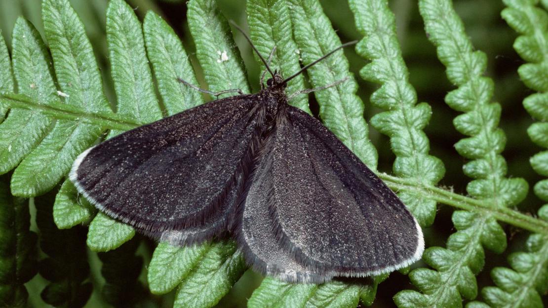 This understated moth is almost entirely black but for delicate white fringes at the edges of the forewings. The wings can begin to look browner with age and wear.