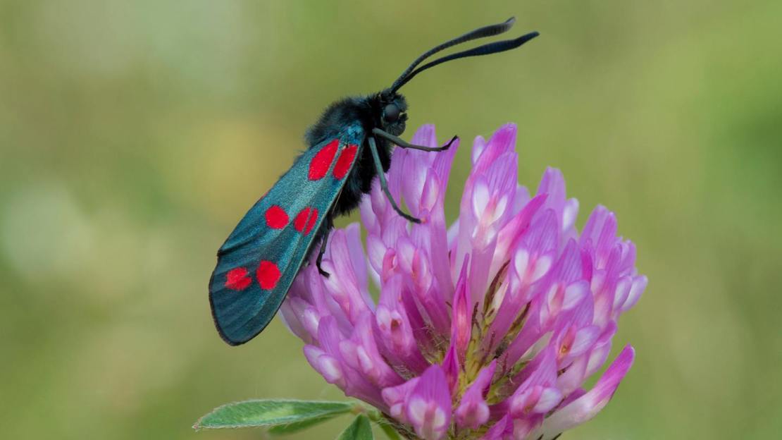 This little stunner can be easy to mistake with other buzzing insects when in flight. When at rest look for its furry black body and luxurious antennae. The black forewings have an iridescent sheen and six red spots that can sometimes become fused. The hindwings are red with a black border.