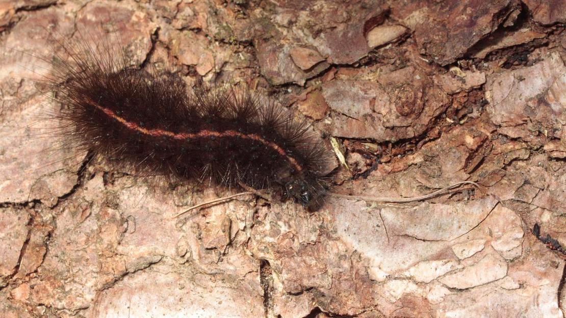 Look for black bands separating sections of bristly brown hairs. A broken white line also runs along the caterpillar's sides with a row of small white spots beneath.
