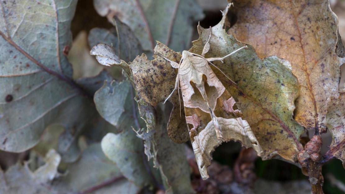 Another master of disguise that blends in perfectly with fallen autumn leaves. Look for the warm orange-red areas in the centre of the forewings and the intricately scalloped wing edges. There is also a distinct pale line that runs across both wings.