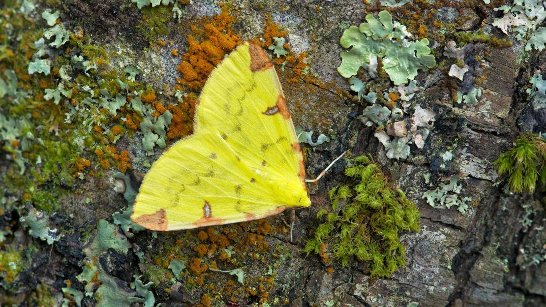 Like its butterfly namesake, this moth is a bright canary yellow. Look for the brown markings on the leading edges of the forewings and the two silvery, crescent-shaped eye spots. Sometimes flushed from hedgerows during the day.