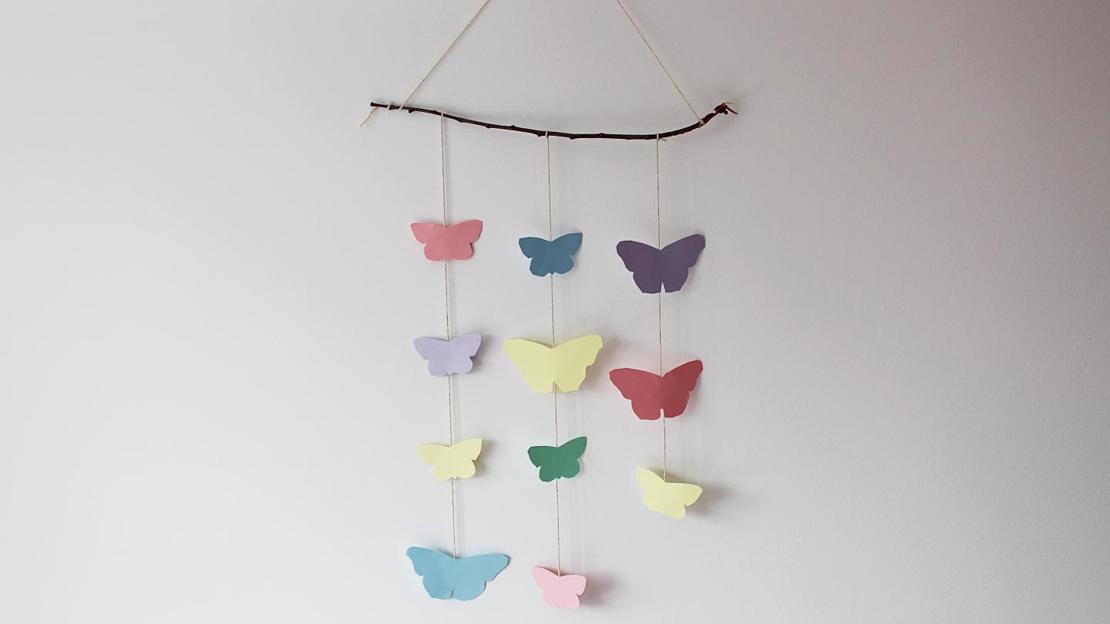 - Cut a few pieces of string in different lengths and tie them to the stick. Attach your butterflies to the string with a small piece of tape on the back of each one.