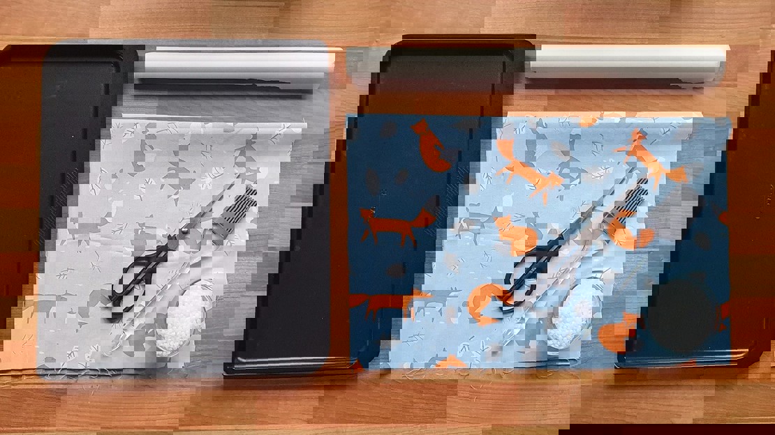 Cut the fabric to the desired size – it will need to fit on your baking tray. Pinking shears will give a nice zigzag finish but if you don't have any, scissors are fine.