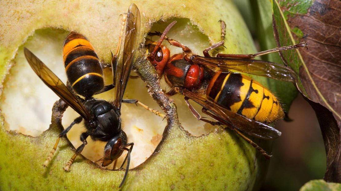 Nesting low in hedges and brambles or high in trees, Asian hornets are mostly black with a thick orange band on the abdomen and yellow tips on their legs. Look for them feeding on flowering and fruiting plants like ivy, apples and grapes.
