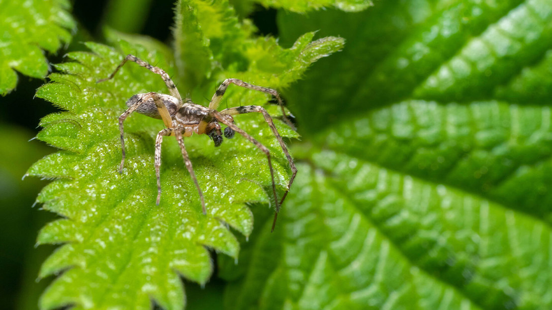 This common spider is usually found in long grass and dense vegetation, where it hunts prey including flies and other small insects using speed and strength. It ranges from 10–13mm (males) or 12–15mm (females) in size and can vary in colour from a muted grey to dark orange and brown. It’s most easily recognised by its shape and posture – it has a slender abdomen and likes to rest with two pairs of its front legs pointing forwards. There’s also usually a pale, vertical line down the centre of its abdomen and pale ‘tear marks’ at the sides of its eyes.